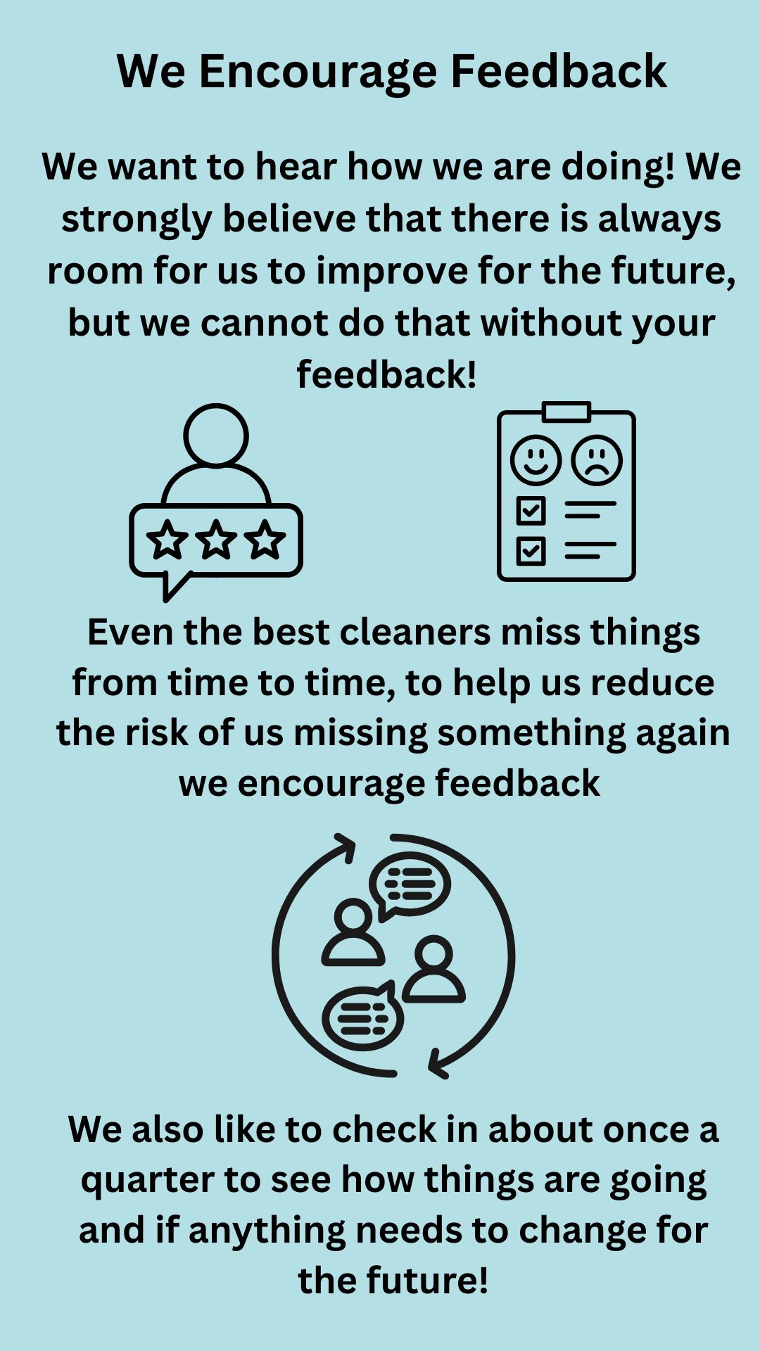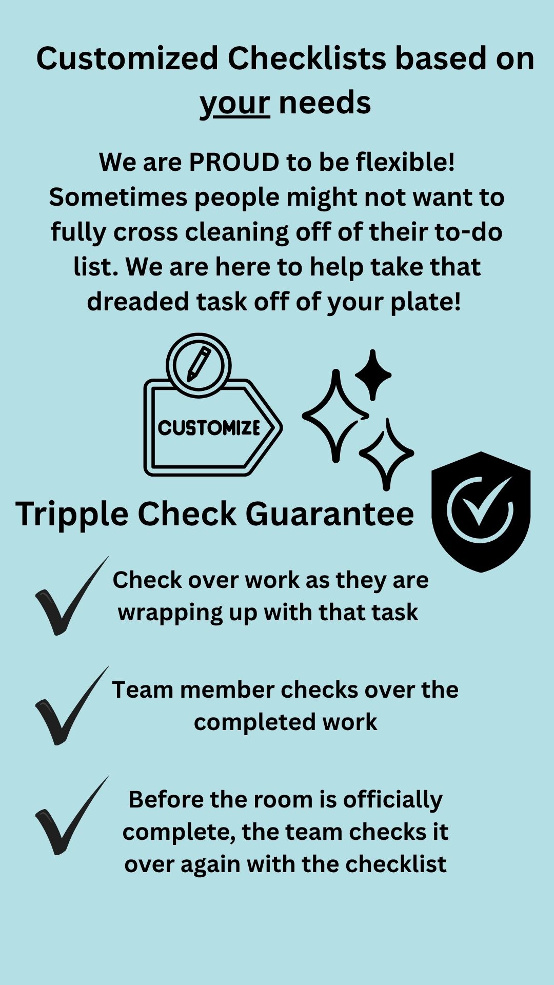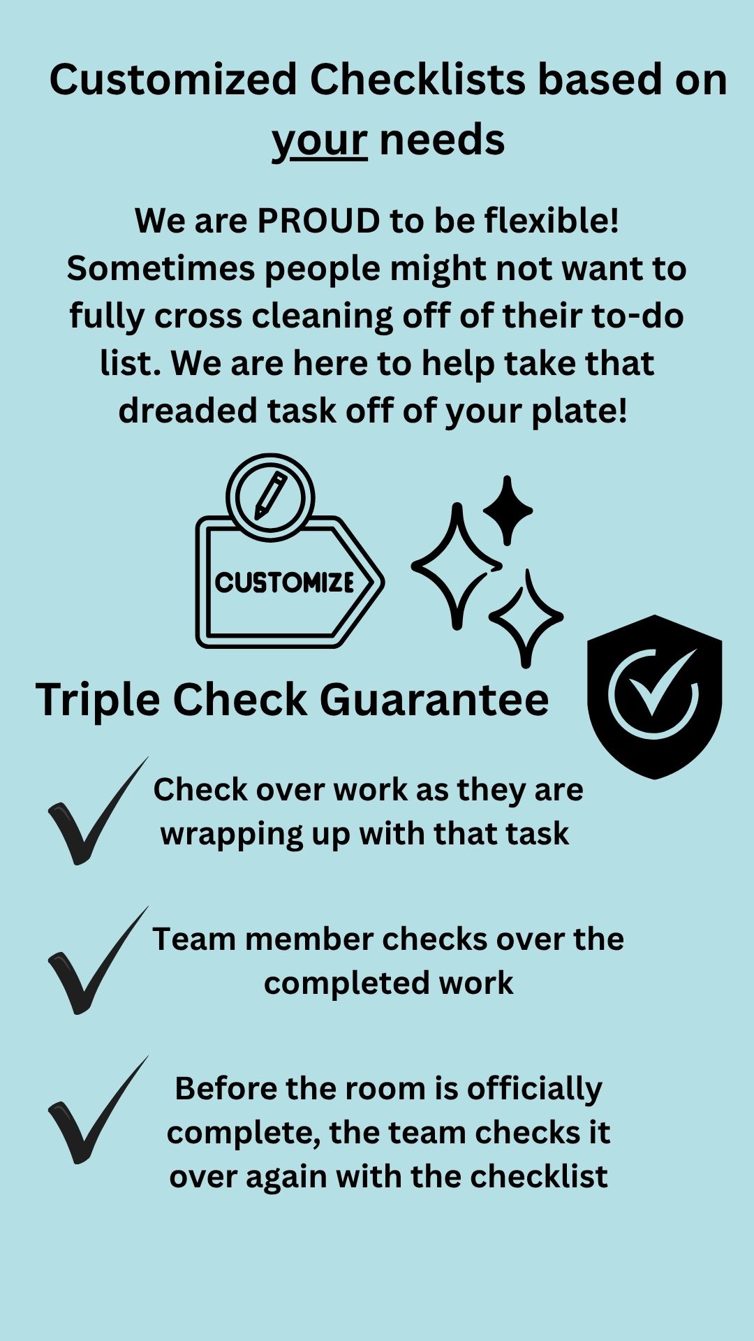 We are very proud to be flexible as possible! Cleaning schedules are curated for your needs, instead of fitting you into a cookie cutter program. Whether there are tasks that do not need to be done every time, or maybe you only really need your bathrooms and floors done - We got your back, and are thankful for the opportunity to save you some time.